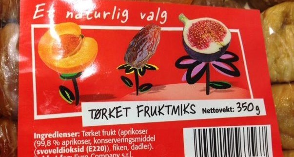 På en kg tørket frukt som aprikoser, fersken og druer (altså rosiner), er det lov å ha inntil 2000 mg svoveldioksid og sulfitter samlet pr kg. – det vil si 2 mg pr. gram frukt. Om et barn på 25 kg skal holde seg innenfor grensen på 17,5 mg svoveldioksid, kan det kun spise mellom 8 og 9 gram rosiner – eller aprikoser. Det vil igjen si ca 20 rosiner eller 2 aprikoser. Og veier du 50, kan du spise 4 aprikoser. Er du en storforbruker da? For det er det Mattilsynet har svart hver gang jeg har tatt dette opp – at grensene for ADI ikke kan overskrides – ikke engang av storforbrukere. Det er fint at EFSA nå forteller at de har tatt feil.