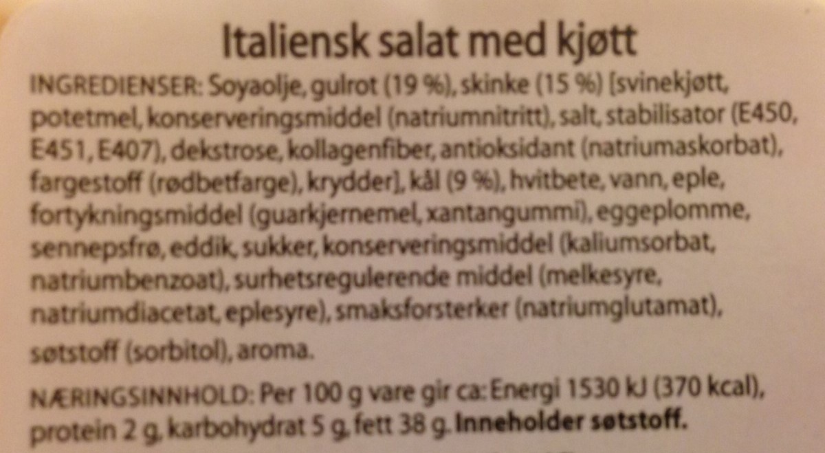 Eksempelvis på ultraprosessert mat som mange bruker, kan være italiensk salat med kjøtt (eller rekesalat, kyllingsalat, rødbetesalat osv). Du ser kjøttbitene og kanskje noen gulrotbiter, men hva sausen er laget av, er det ikke mulig å se.