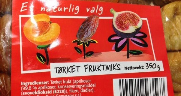 Jeg skriver «kunne» og ikke «kan» fordi EFSA har vurdert ADI for sulfitt på nytt og opplyser nå at bruk av sulfitt kan være skadelig. Ny ADI er ikke foreslått, men det er snakk om en halvering. Da blir det i alle fall ikke mange aprokosene igjen! Mattilsynet har skrevet en artikkel om dette og anbefaler nå at tørket frukt med sulfitt (særlig aprikoser og rosiner) ikke gis til barn under 3 år.