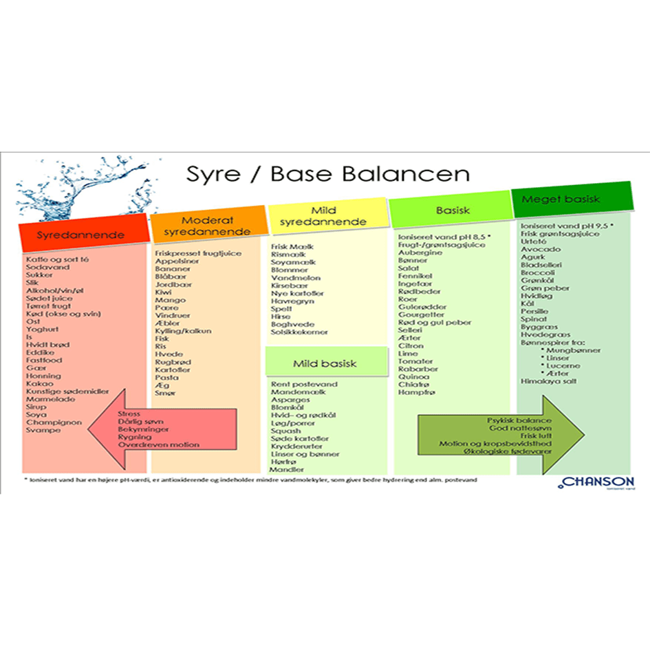 Sukker er eksempelvis noe av det mest syredannende, sitron basedannende. Frisk frukt, grønnsaker, røtter, rotknoller, nøtter og bønner danner i all hovedsak base i kroppen når det blir fordøyd (frigjør en alkalisk restingrediens). Fisk, kjøtt, egg, fjørfe, skalldyr, ost, melk, korn og sukker danner i all hovedsak syre (gir en sur restingrediens).